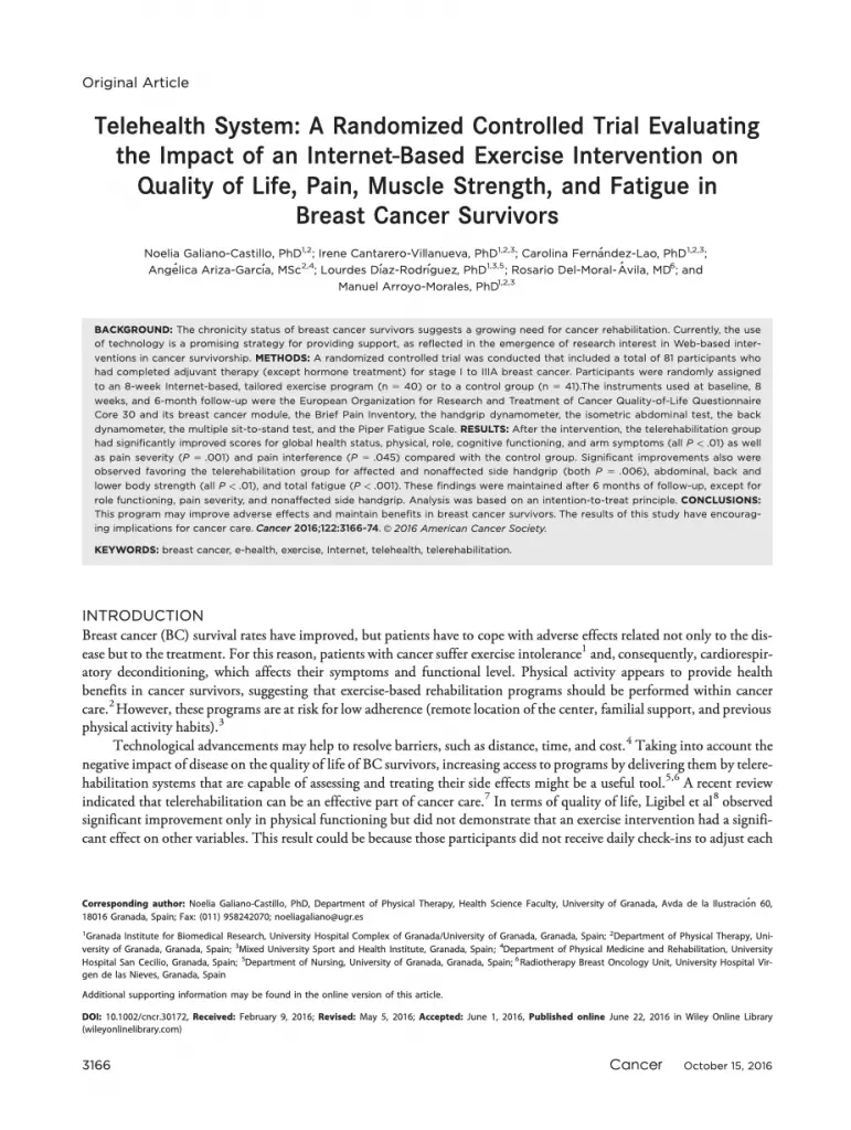 Telehealth System: a Randomized Controlled Trial Evaluating the Impact of an Internet-Based Exercise Intervention on Quality of Life, Pain, Muscle Strength and Fatigue in Breast Cancer Survivors